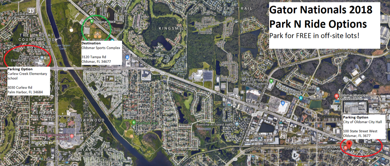 This Google map shows the locations of the free park and ride shuttle stops being offered for this weekend’s 2018 Gator Nationals event at the oldsmar Sports Complex. (City of Oldsmar) FREE Parking Shuttle at Curlew Creek Elementary School Free parking will also be available at Curlew Creek Elementary School, located at 3030 Curlew Rd. in Palm Harbor. NOTE: Approximately 90 spots will be available on a first come-first serve basis. Gates will open and close at these designated dates/times: Saturday, February 24, 7am—Sunday, February 25, 7am—3pm (If vehicle is left, it will be locked behind the gates with no access)