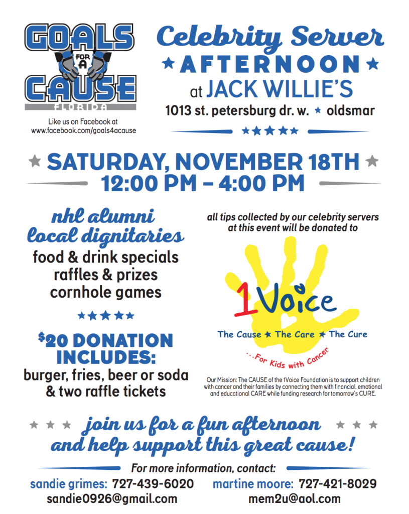 The fun kicks off with the popular celebrity server event at Jack Willies in Oldsmar on Saturday, Nov. 18, from noon to 4:00 p.m., to be followed by the annual Senior Hockey Tournament Nov. 24-26 at the Tampa Bay Skating Academy.