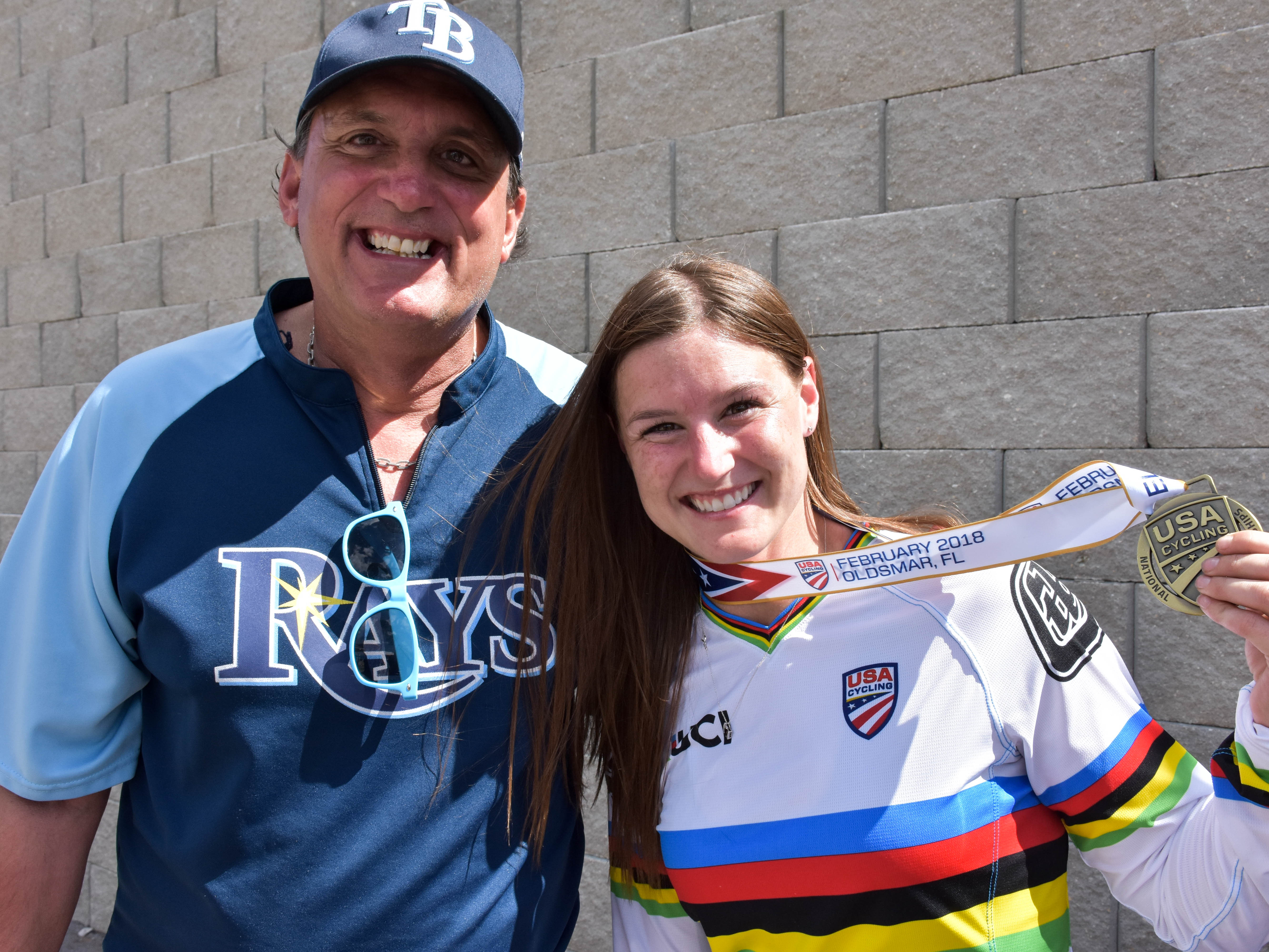 Oldsmar Mayor Doug Bevis poses with American rider Alise Willoughby, who won her 8th straight USA BMX National Championship at the 2018 Gator Nationals.