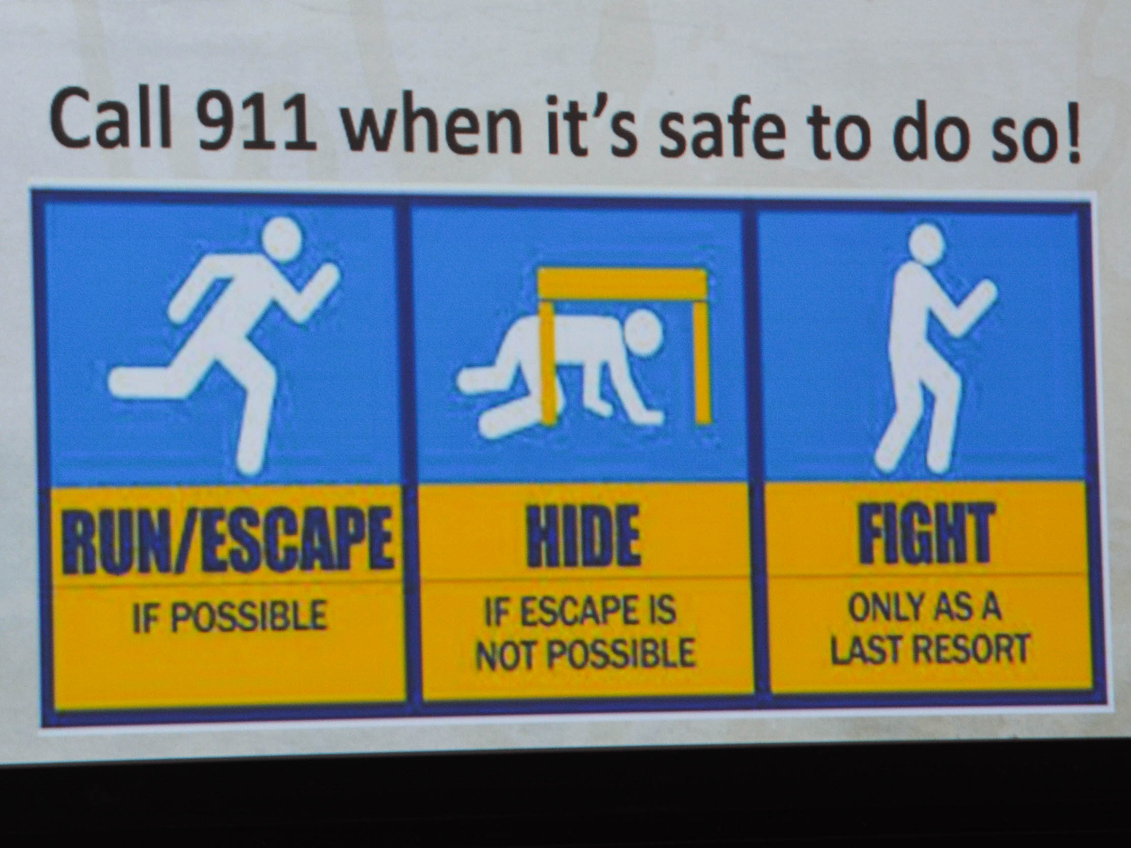 “And if you can’t leave, get to a secure area,” he said. “An interior room, a mop closet, somewhere that provides adequate protection from bullets. And make sure you don’t alert the shooter to your presence. Silence your cell phones. That’s something people don’t usually think of.”