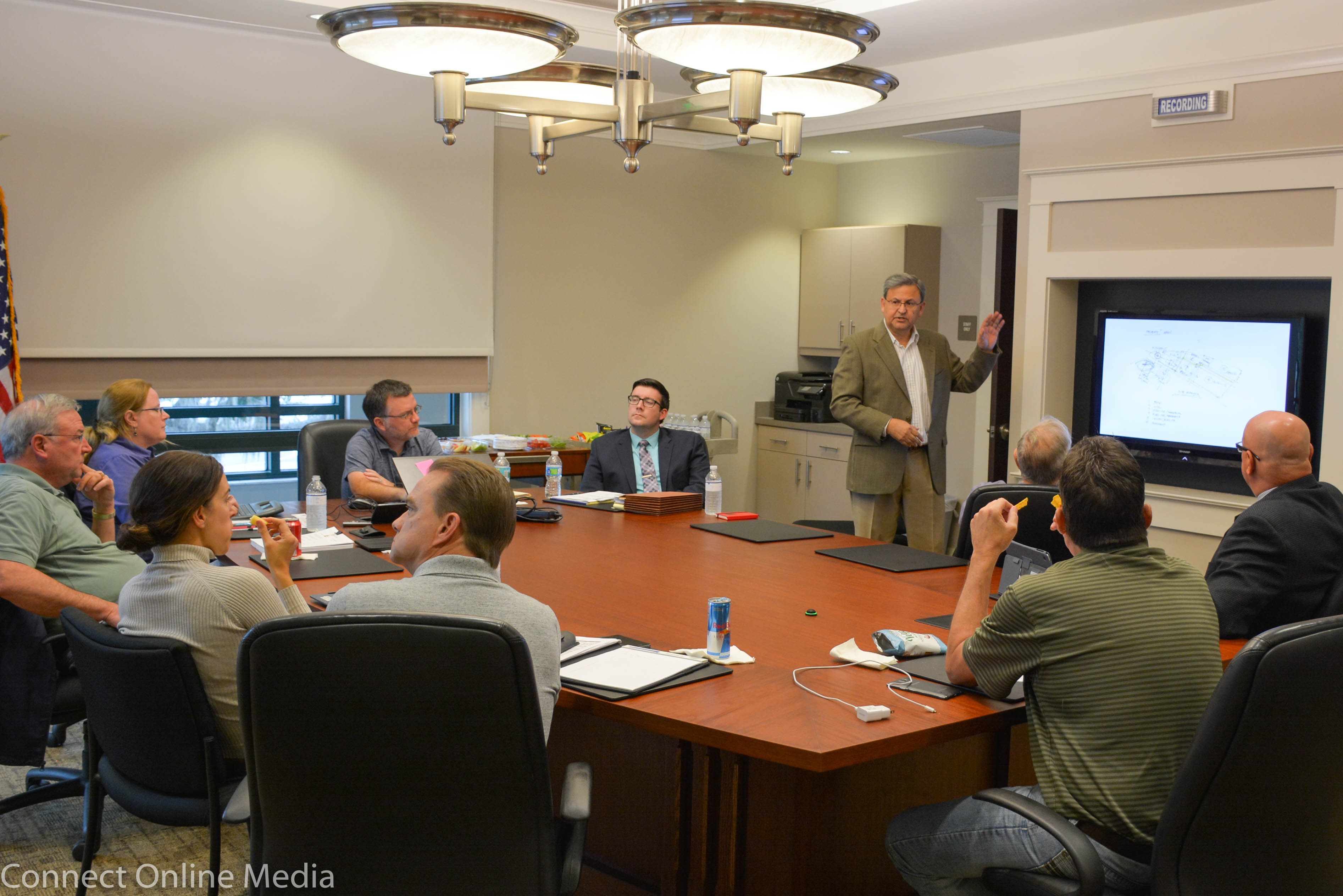 Tampa architect Francisco Semsch explains his and John Bews’ (seated, center left) downtown development concept to Oldsmar officials on Jan. 10, 2017.