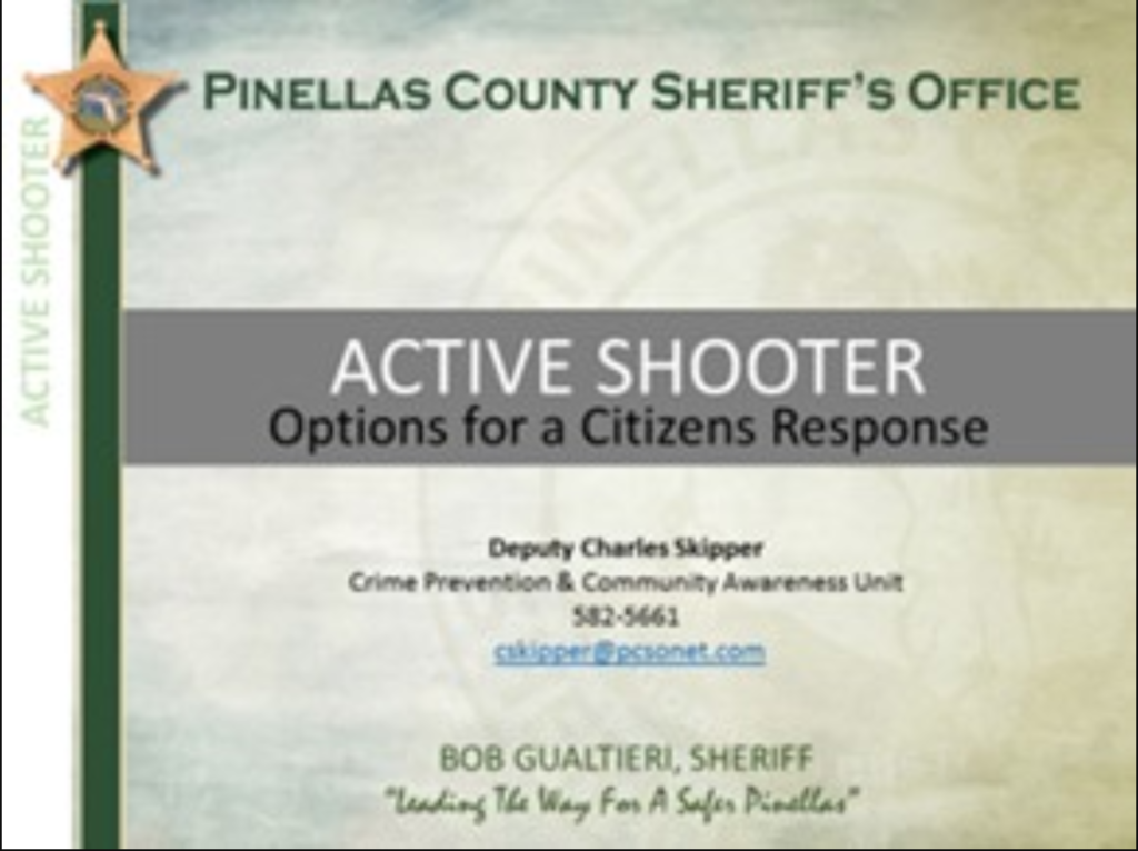 The Upper Tampa Bay Chamber of Commerce is hosting an active shooter presentation featuring Pinellas County Sheriff’s Department officials, on Thursday, Dec. 14 at Nielsen Media, located at 501 Brooker Creek Blvd. in Oldsmar.