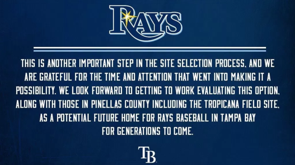 “The statement the Rays put out was like, ‘thanks for the input, we’ll think about it, but we’re still thinking about the Pinellas and St. Pete offers, too,’” Bevis told Oldsmar Connect by phone on Wednesday.