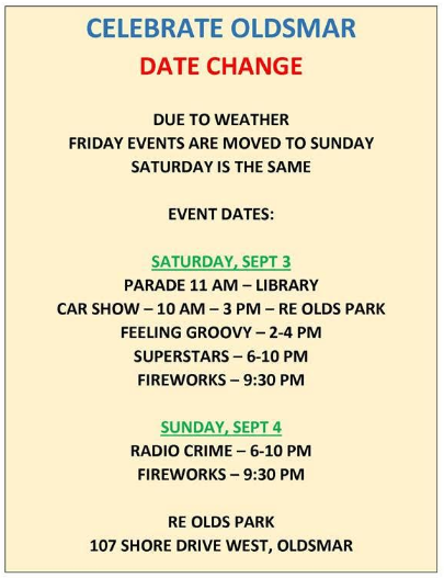 However, officials decided to move the opening day of this weekend’s Celebrate Oldsmar! festival from Friday to Sunday in order to be clear of any lingering effects of Hermine.
